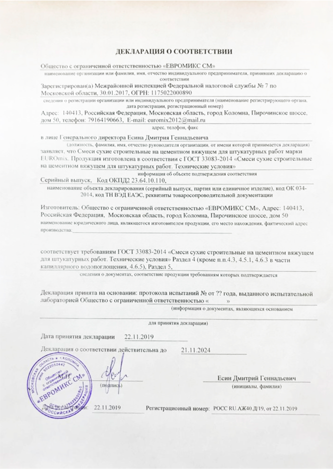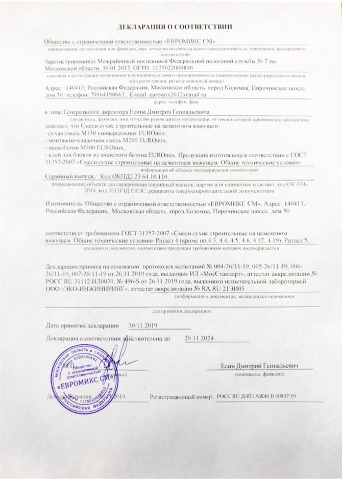 Технологи нашего производства постоянно проводят оценку контроля качества на каждом этапе. Мы берем лучшие технологии с последних мировых разработок и применяем на практике. Продукция «Euromix» отвечает самым строгим требованиям технической документации и имеет сертификаты соответствия, что в свою очередь является гарантией высокого качества материалов.